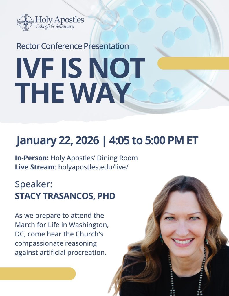 We are pleased to welcome Dr. Stacy Trasancos, who will give a special talk on “IVF Is Not The Way” and the Church’s pro-life witness. This presentation will be offered to all and will take place in St. Peter’s Refectory.