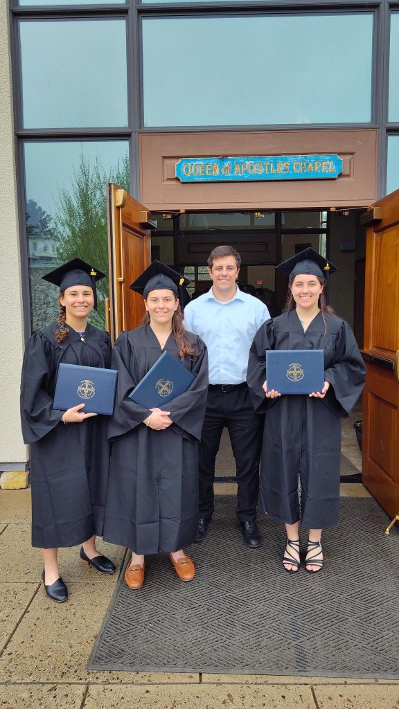 Earning a college degree is a special moment in a person’s life: the culmination of years of hard work. It’s especially exciting to have two members of your family graduating with you. This was the case this past April 26, when sisters Mary, Sara, and Elizabeth Shopa traveled from Georgia to Connecticut to attend Holy Apostles College and Seminary’s 67th Commencement and Baccalaureate Mass and, together, received their diplomas after earning Bachelor of Arts degrees in English in the Humanities. In attendance to see his sisters graduate was their older brother, Steven, himself a 2020 graduate of Holy Apostles with a Bachelor of Arts degree with double majors in History in the Social Sciences and Philosophy.